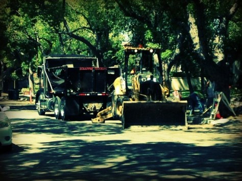 They started the sidewalk beautification project, which consists of tearing up sections of sidewalk to cut out all of the tree roots underneath. Genius, right? They very thoroughly cut the tree roots off the tree in front of our bedroom on both the street side and the sidewalk side, so I’m looking forward to adding that tree to our bedroom decor during the next wind storm. It will give the room a more rustic modern feel, which is good, because I was really wondering what to do in there anyway.